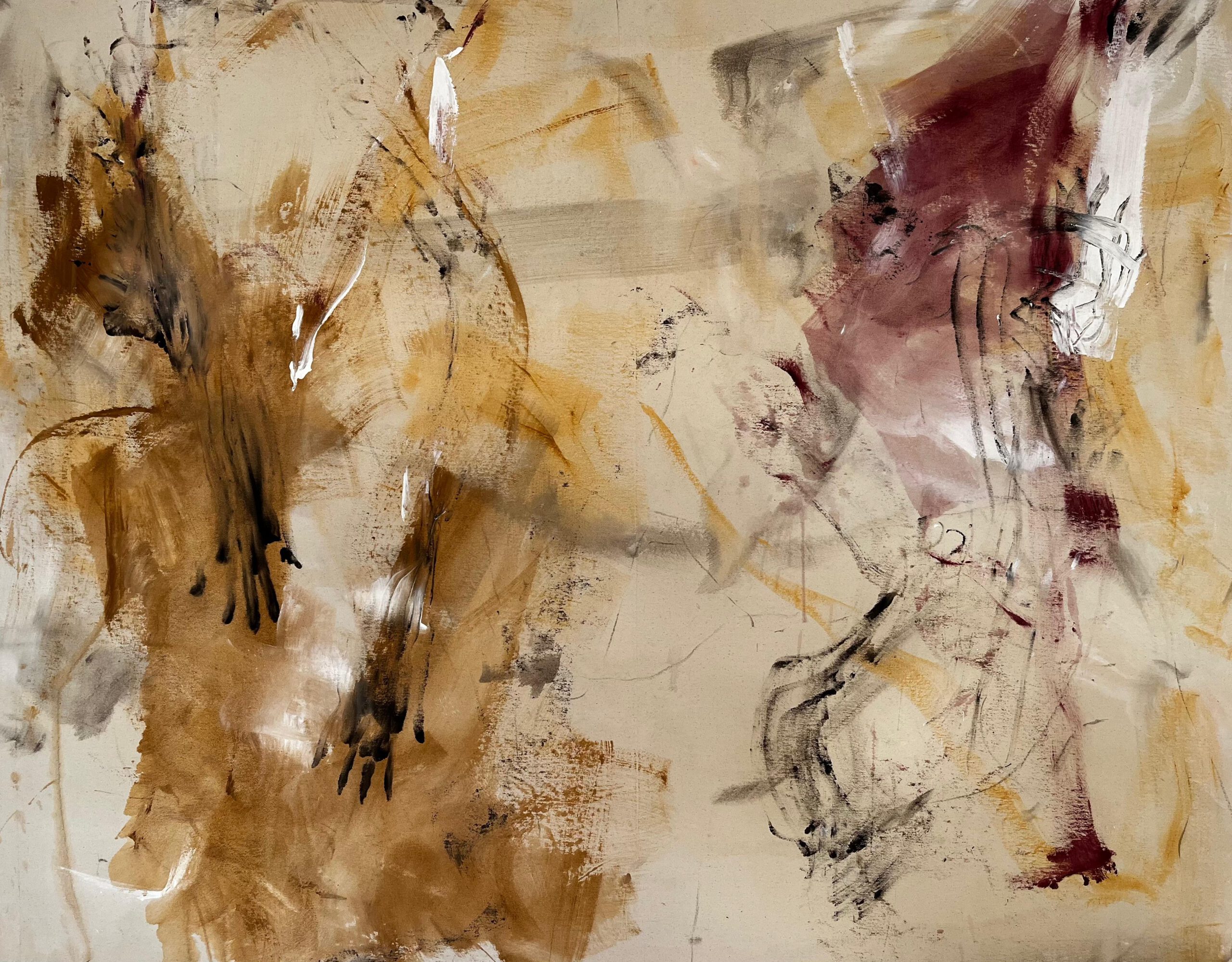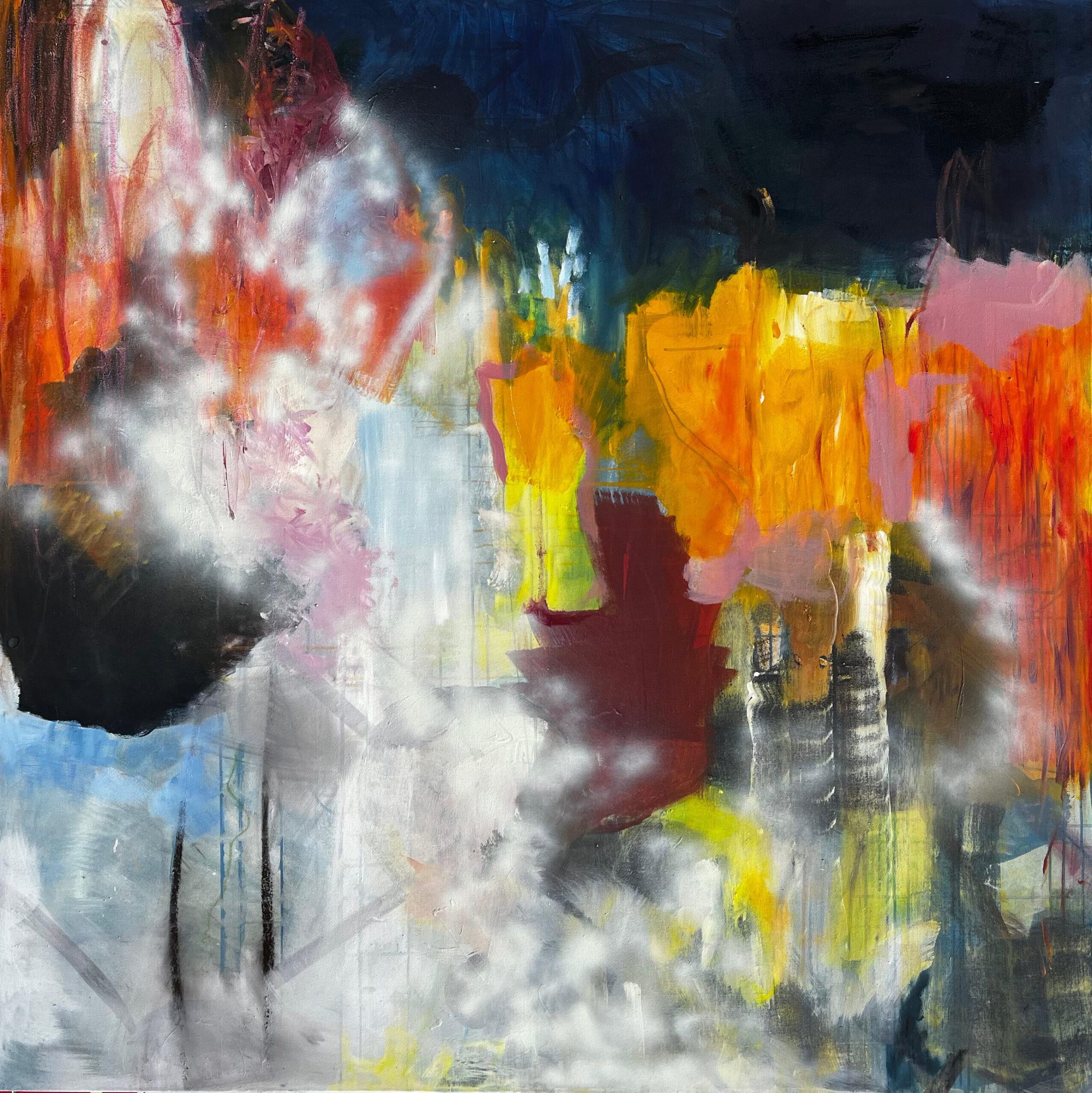 Von innen nach außen. Die innersten Schwingungen nach außen bringen. Diesen Prozess nachempfinden durch intuitives Malen direkt vor der Leinwand, ohne zu erahnen was entsteht, dann zurücktreten und das unfertige Bild mit Abstand betrachten. Das Bild im Ganzen wahrnehmen, um dann weiterzuarbeiten, zu überlagern, zu verändern und zu verfeinern. Immer die Komposition im Blick, um spannende Verhältnisse zu schaffen.